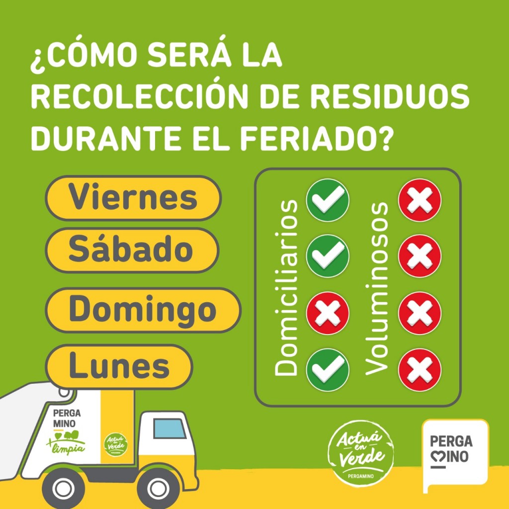 La Municipalidad de Pergamino informa cómo será la recolección de residuos domiciliarios y voluminosos durante el fin de semana largo que se aproxima.