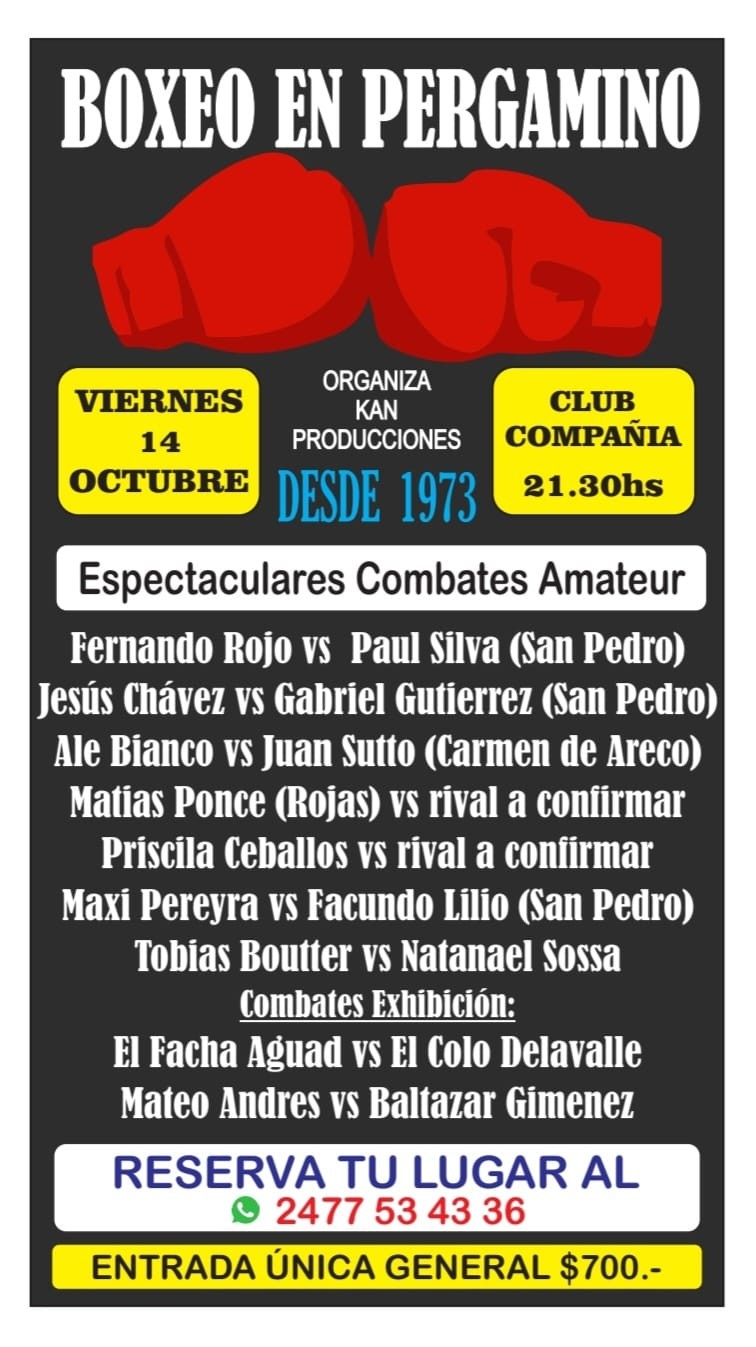 El viernes 14 de octubre se llevará a cabo el octavo festival boxístico de esta temporada, en este caso de carácter amateur. Será en el club Compañía desde las 21:30. Las peleas confirmadas hasta el momento son: Fernando Rojo (Pergamino) vs. Paul Silva (San Pedro), Jesús Chávez (Pergamino) vs. Gabriel Gutiérrez (San Pedro), Alejandro Bianco (Pergamino) vs. Juan Sutto (Carmen de Areco), Matías Ponce (Rojas) vs. Rival a confirmar, Priscila Ceballos (Pergamino) vs. Rival a confirmar, Maxi Pereyra (Pergamino) vs. Facundo Lilio (San Pedro), Tobías Boutter vs. Natanael Sosa,. Además habrá dos exhibiciones: José Luis “Facha” Aguad vs. Renato “Colo” Della Valle, Mateo Andrés vs. Baltazar Giménez.