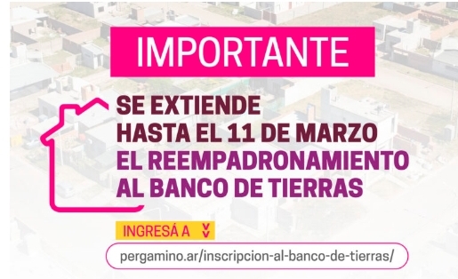 Se recuerda a los grupos familiares que quieran anotarse en el Banco de Tierras, que deberán inscribirse al Registro de Demanda Permanente de Tierra ingresando a https://pergamino.ar/inscripcion-al-banco-de-tierras/.
