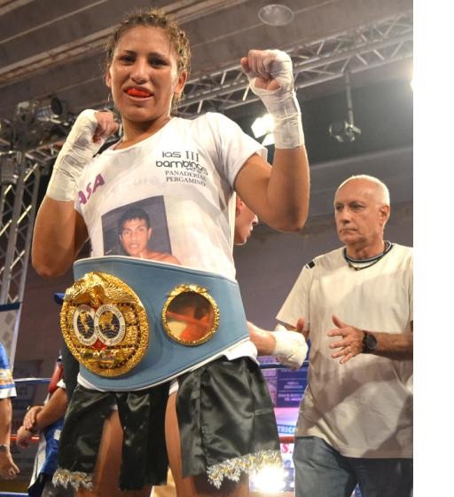 La pergaminense se adjudicó la corona mundialista FIB de la categoría Superpluma. El sábado, en el estadio de Comu, la joven de nuestra ciudad venció por nocaut a la griega Areti Mastrodouka, sigue invicta y haciendo historia en el boxeo femenino. Por su parte, Julián Aristule venció por puntos a Diego Sañanco de Trelew. (Foto: Pablo Perrotta-El Tiempo)